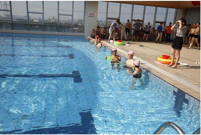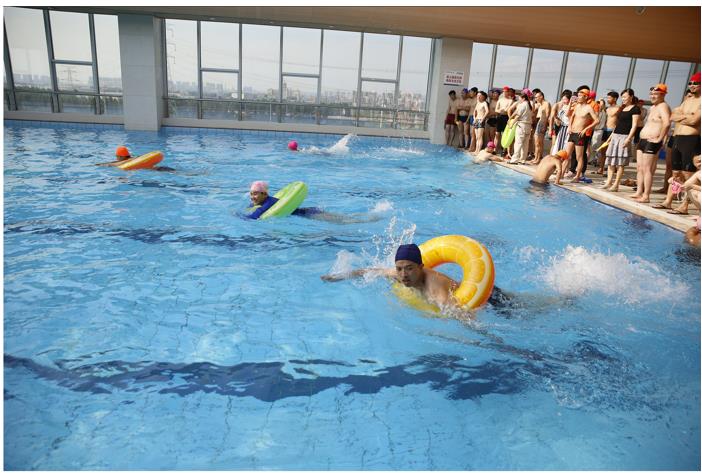 笑鬧(nào)之後賽程進入最後(hòu)環節:花(huā)樣接力賽。每隊選派4名隊員完成4×50米接力。蛙泳、蝶泳(yǒng)、仰泳、自由泳,各類泳姿在泳(yǒng)池中激起了翩(piān)翩浪花。此項環節的重頭戲在於每組(zǔ)需有一名隊(duì)員全程套著遊泳(yǒng)圈完成!這可難倒了遊(yóu)泳健(jiàn)將們,於是,有的便開啟了長久的原地圓周運動模式,隊友不得不下水接應。